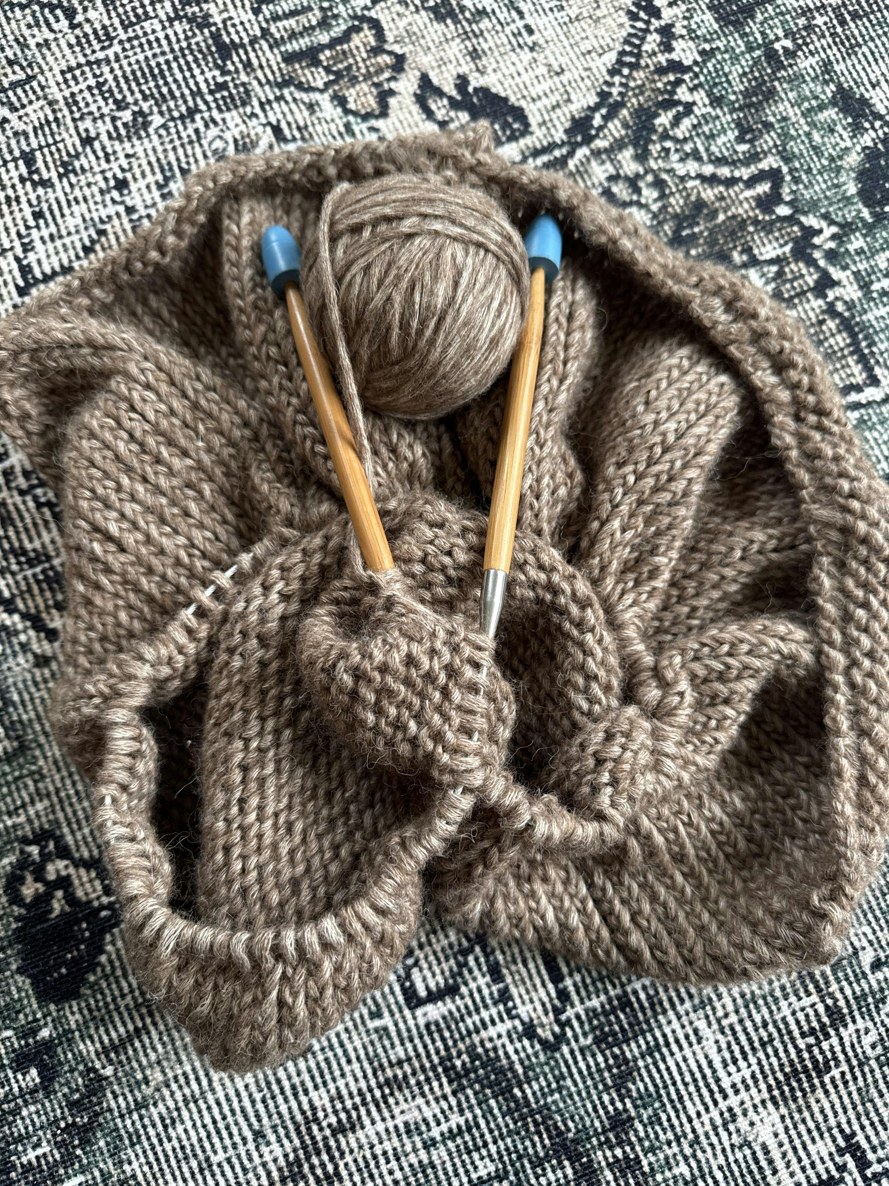 It’s knit flat in pieces and seamed for structure, so it keeps its shape over time and fits beautifully.